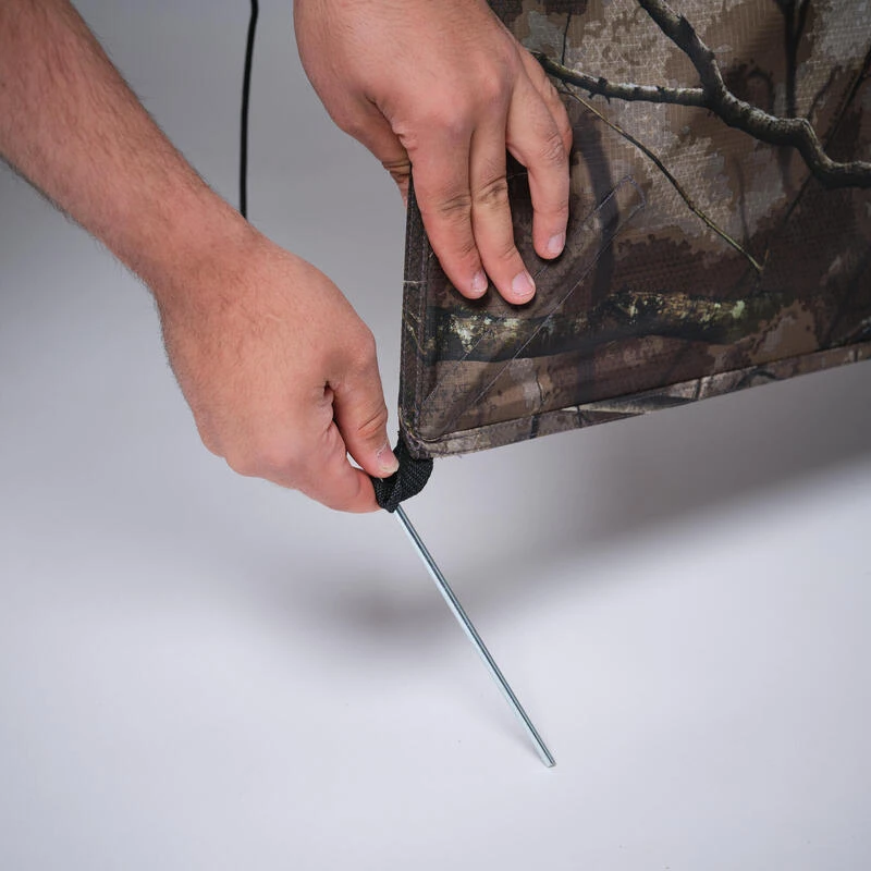 Afin d’augmenter sa hauteur, il est possible d’ajouter le bandeau de camouflage en mesh supplémentaire. (Hauteur de l’affût avec la bande : 170cm et longueur: 135cm). Ce bandeau permet de voir à travers tout en restant dissimulé derrière l’affut.