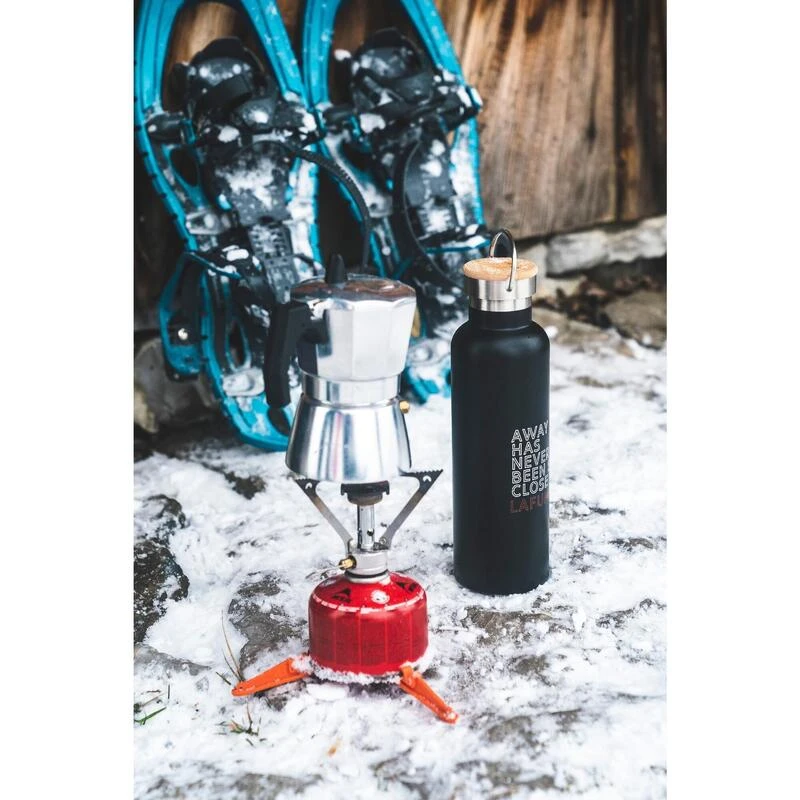 >, l’aventure est au détour du chemin, cette phrase décore la magnifique bouteille thermos en acier inoxydable NUNATHERM 0,75 L pour vous inspirer au quotidien
