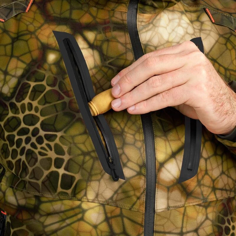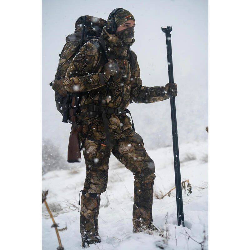 Notre équipe de conception a imaginé cette veste chaude et imperméable pour les chasseurs à l’approche et à l’affut de grand gibier par temps froidDans les conditions difficiles, cette veste vous garde au sec et au chaud jusqu’à -5°C. Utilisez le masque dans la capuche pour vous camoufler, et les zips d’aération pour évacuer la transpiration.